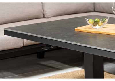 Bordet har en solid ramme i sort pulverlakkert aluminium med kantede profiler som gir et moderne uttrykk. Bordplaten er laget i robust komposittstein med melert overflate som tåler både vær og daglig bruk. Design og materialvalg sikrer lang levetid og minimalt vedlikehold.