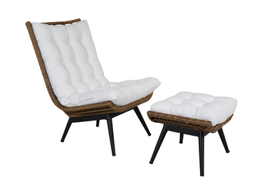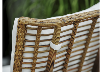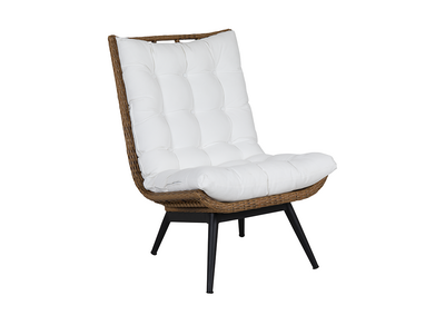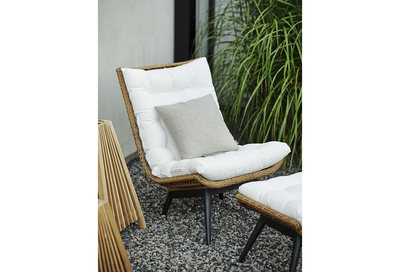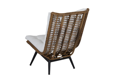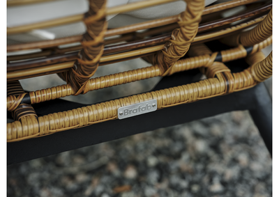 Covelo loungestol fra Brafab kombinerer stilren design med høy komfort. Den luftige konstruksjonen i naturfarget kunstrotting gir et lett og innbydende uttrykk, mens den hvite puten i olefinstoff sørger for behagelig sittekomfort. Den avslappede vinklingen på ryggstøtten gjør stolen ideell for lange, avslappende stunder utendørs.