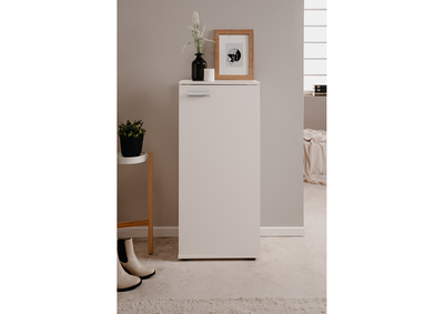 Satos Skoskap er laget av spon, folie og melamin, noe som sikrer slitesterke overflater som tåler daglig bruk. De tilgjengelige fargealternativene gir et moderne og rent uttrykk som smelter inn i ethvert interiør. Den glatte overflaten gjør skoskapet enkelt å rengjøre og holde ved like.