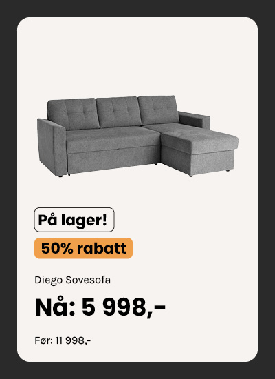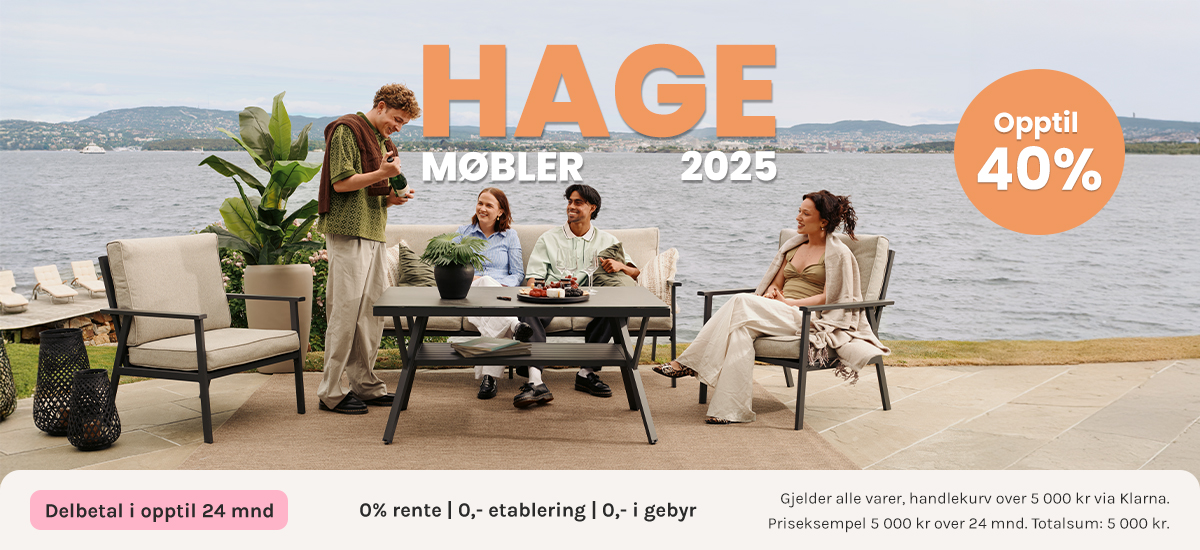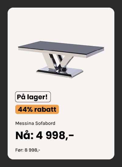 Her vil du alltid finne et bredt utvalg av gode tilbud til hagen, stuen, spiseplassen og soverommet. Enten du ønsker å oppgradere utemøblene eller skape en ny atmosfære i stuen, har vi garantert noe for deg. Vi tilbyr et bredt utvalg av tilbud blant sofaer, spisebord, senger, sofabord, tv-benker og mye mer, slik at du alltid kan finne et kupp til ditt hjem.