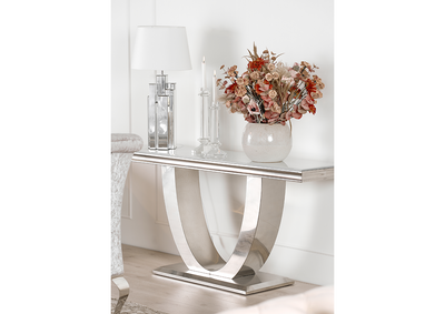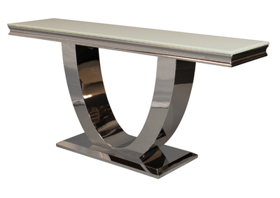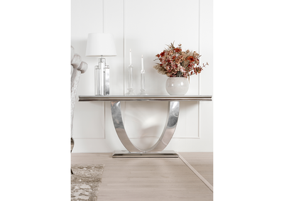 Firenze Konsollbord er et elegant møbel som tilfører et snev av luksus til ethvert rom. Med en bordplate i hvitt glass og et understell i rustfritt stål, utstråler dette konsollbordet moderne eleganse. Den sølvfargede finishen på understellet gir bordet et eksklusivt utseende, perfekt for moderne interiør.