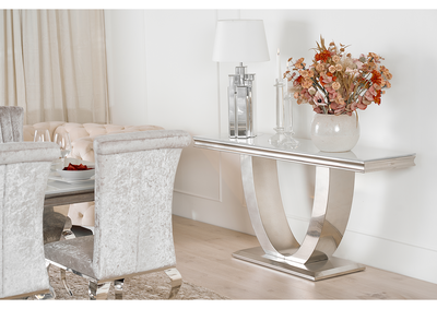 Firenze Konsollbord er ikke bare vakkert, men også bygget for å vare. Understellet i rustfritt stål gir en solid base, mens den hvite glassplaten er både elegant og enkel å vedlikeholde. Dette bordet er designet for å tåle daglig bruk samtidig som det bevarer sitt stilige utseende.