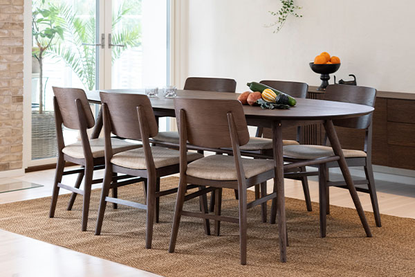 Joel spisebord skiller seg ut med sin ovale bordplate og dreide ben i massiv eik. Denne designen tilfører et sofistikert og tidløst preg til din spisestue, og kompletterer enhver innredning fra det moderne til det klassiske. Dens bordplate i fineret røkt eik gir en dyp og varm atmosfære, og inviterer til lange, hyggelige middager.