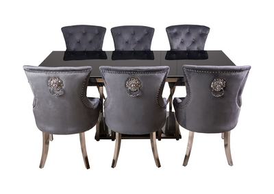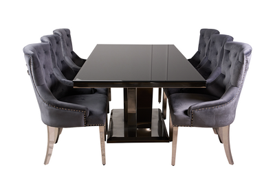 - Seks komfortable spisestoler i mørkgrå velour med rustfrie ståldetaljer