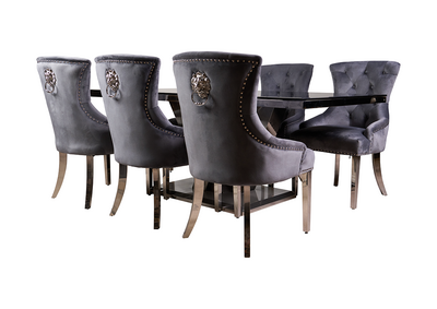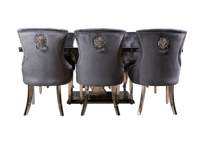 Megan Spisestolene er trukket i mørkgrå velour og gir en luksuriøs følelse til spisegruppen. De solide benene i rustfritt stål og de elegante detaljene som nagler og et håndtak med løvehode på ryggen, gjør disse stolene til et blikkfang. Stolene gir også utmerket støtte til ryggen, slik at du og dine gjester kan sitte komfortabelt gjennom lange middager.