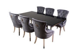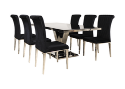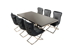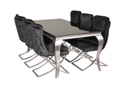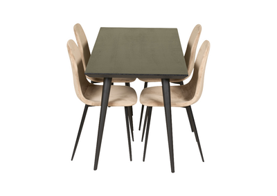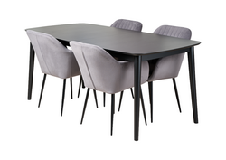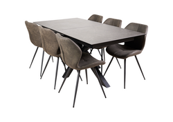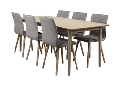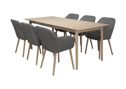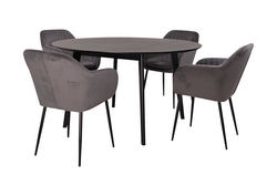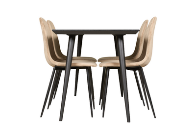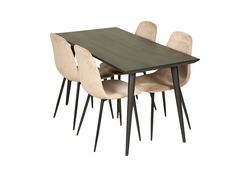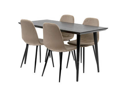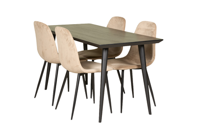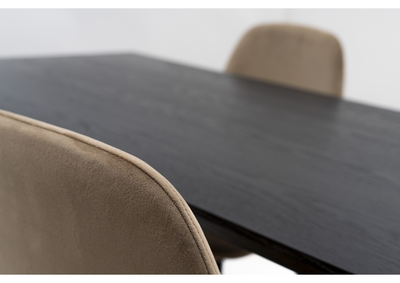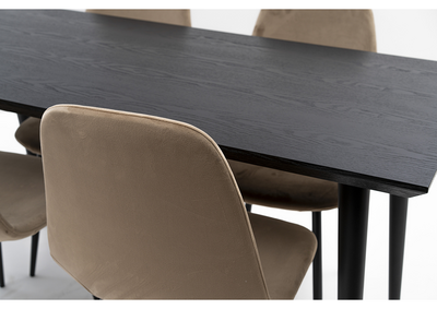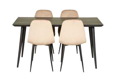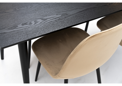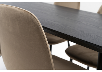 Trend Spisebordets elegante eikefiner bordplate og robuste sorte metallben sikrer en slitesterk kvalitet som varer. Sammen med Trend Spisestoler, kledd i luksuriøst velourstoff, tilbyr dette settet både komfort og en uovertruffen holdbarhet som tåler daglig bruk.