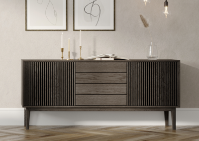 Skjenken er utstyrt med to dører og fire skuffer i midten – alle med push-open funksjon som gjør håndtak overflødige. De dekorative lamell-dørene gir en fin dybdefølelse og skaper et levende fargespill i treverket. Den glatte overflaten på skuffefrontene og det rene uttrykket i skroget understreker det moderne preget.