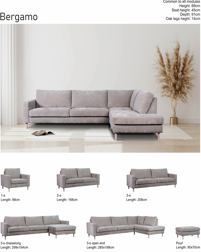 Bergamo Sofa er tilgjengelig i flere konfigurasjoner for å møte ulike behov. Du kan velge mellom 1-seter, 2-seter, 3-seter, 3-seter med sjeselong, 3-seter med åpen hjørneløsning, og puff. Hver konfigurasjon tilbyr samme høye nivå av komfort og kvalitet, slik at du kan finne den perfekte løsningen for din stue.
