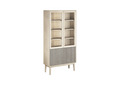 Vitrineskapet har glass i øvre del av dørene, som gir deg muligheten til å vise frem dine fineste glass, serviser eller dekorative elementer. Bak de delte dørene finner du justerbare trehyller som enkelt kan tilpasses etter behov, slik at du får optimal utnyttelse av plassen.