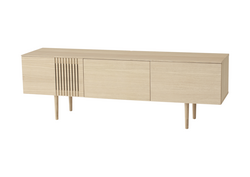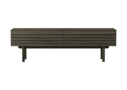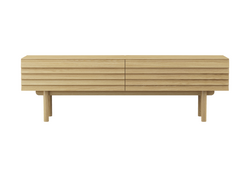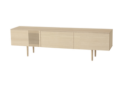 Cavo TV-benken utstråler en sofistikert atmosfære med sin rektangulære form, lameller og trehåndtak, noe som understreker skapets naturlige og moderne utseende.
