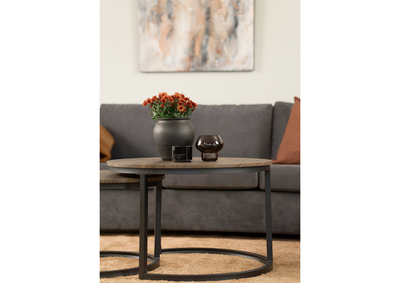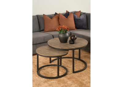 Hastings sofabord er laget av to deler som kan brukes sammen, som vist på bildet, eller separat ved å oppbevare det mindre bordet under det største. Dette gir deg stor fleksibilitet og muligheter til å tilpasse bordet etter dine behov. Den unike utformingen av bordet, med runde kanter og former, gjør det trygt for familier, samtidig som det beholder sin moderne og industrielle estetikk.
