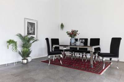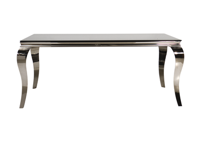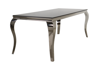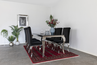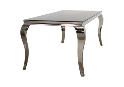Bordplaten er laget av herdet sort glass, som er både holdbart og lett å vedlikeholde. Understellet i rustfritt stål sikrer stabilitet og lang levetid, samtidig som de elegante, buede bena gir bordet et unikt utseende. Lavezzi spisebord er designet for å vare, og vil være et midtpunkt i din spisestue i mange år fremover.