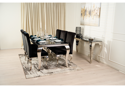 Lavezzi spisebord kombinerer moderne design med funksjonalitet, og gir et elegant preg til enhver spisestue. Bordplaten i sort glass sammen med det sølvfargede understellet skaper en sofistikert og stilfull look. Dette spisebordet er ikke bare et funksjonelt møbel, men også en dekorativ detalj som løfter hele rommet.
