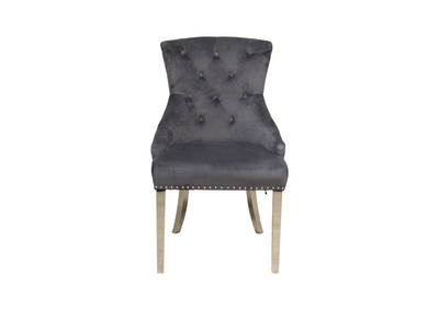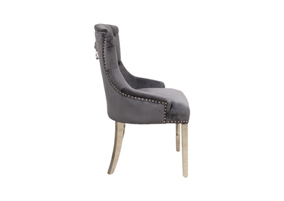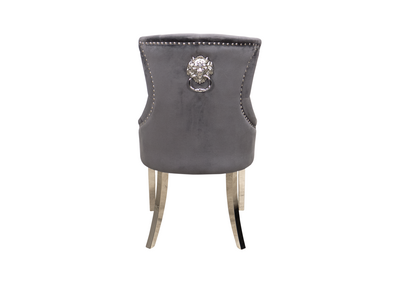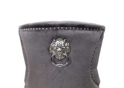 Megan Spisestol er en elegant og klassisk spisestol som tilfører et sofistikert preg til ethvert spiseområde. Trukket i mørkgrå velour, gir denne stolen en luksuriøs følelse samtidig som den er enkel å vedlikeholde. Stolen er designet med fine detaljer som nagler i ryggen og et eksklusivt håndtak med løvehode, noe som gjør den til et blikkfang i ditt hjem.