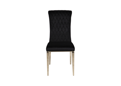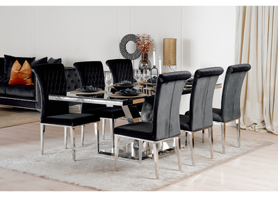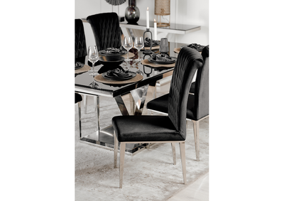Messina spisestol er et vakkert og stilfullt tilskudd til enhver spisestue. Trukket i sort velour-stoff, gir denne stolen en følelse av luksus og eleganse. Det myke velour-stoffet er enkelt å vedlikeholde og gir en fin kontrast til de sølvfargede benene i rustfritt stål. Stolen har en høy rygg som gir god støtte og en komfortabel sitteopplevelse. De fine korssting-detaljene på ryggen fremhever stolens elegante design.