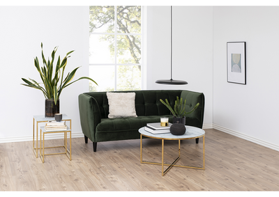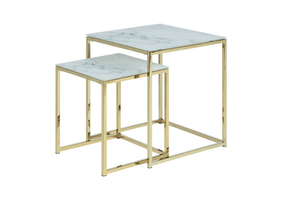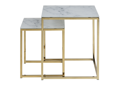 Med bordplater av herdet glass som imiterer marmor, tilbyr Alisma settbordene en luksuriøs følelse uten den tunge prisen og vedlikeholdet ekte marmor krever. De gullkrommede stålbena tilfører et preg av raffinement og sikrer samtidig holdbarhet og stabilitet.