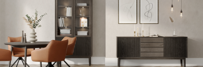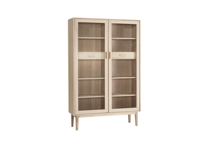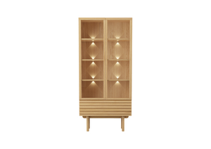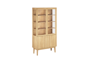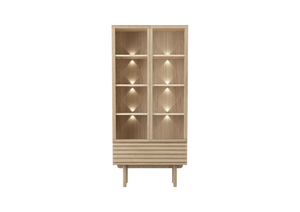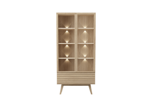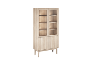 Våre vitrineskap og reoler kommer i et bredt spekter av størrelser, former, farger og behandlinger. De fleste av dem er laget av eik, men behandlingen varierer fra hvitoljet til sortbeiset. Med ulike variasjoner følger også forskjellige funksjoner. Alle vitrineskapene er utstyrt med enten soft-close eller push-open-funksjon på alle dører og skuffer. Vi tilbyr også vitrineskap med både glass- og trehyller, slik at det alltid er noe som passer inn i ethvert hjem.