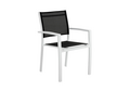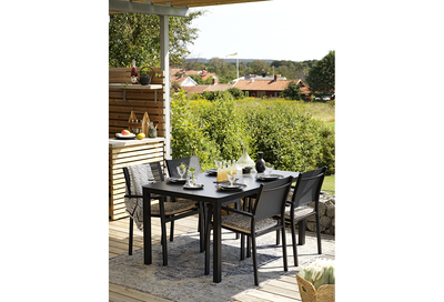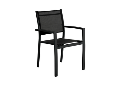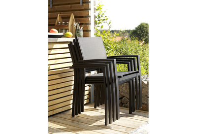 Rana karmstol fra Brafab kombinerer moderne design med høy komfort. Med sin svarte aluminiumsramme og slitesterke textilene-sete, passer denne stolen perfekt til både private uteplasser og kommersielle miljøer. Stolen er lett, men robust, og kan enkelt stables for praktisk oppbevaring.
