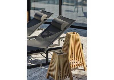 Julita Lampeskjerm lar lys filtrere gjennom de tverrgående teakribbene, og skaper et lekent og inviterende lysspill som kan transformere ethvert uterom til en stemningsfull oase.
