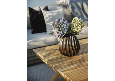 Med tværgående teakribber tilbyr Julita Sofabord ikke bare en estetisk tiltalende overflate, men også en langvarig holdbarhet og naturlig motstand mot utendørselementene. Den naturlige fargen og teksturen i teaken tilfører varme og karakter til ethvert rom.