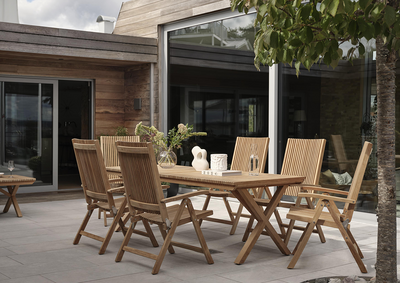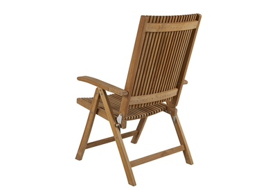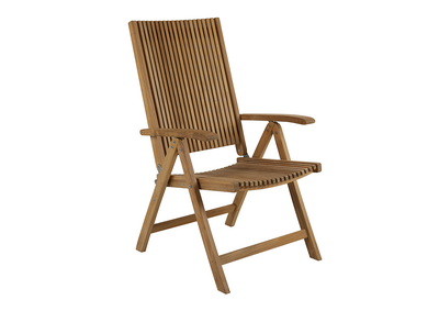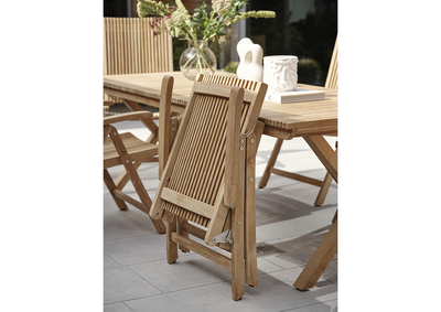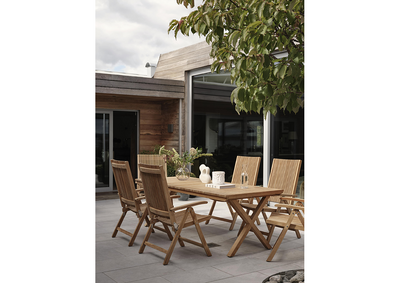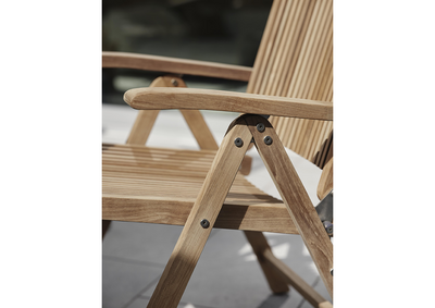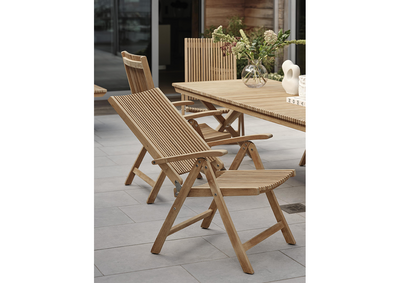 Stolen har justerbare ryggstillinger som gir optimal komfort, enten du nyter en lang middag eller slapper av i solen. De rene linjene og den naturlige teakfinishen gjenspeiler den skandinaviske designtradisjonen, som verdsetter både form og funksjon.