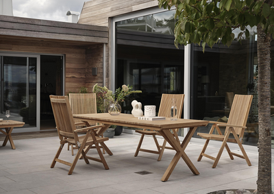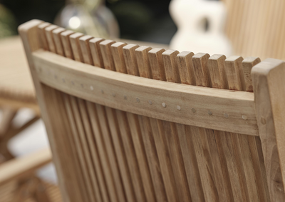 Julita Spisestol er laget av høykvalitets teak, kjent for sin holdbarhet og motstand mot værforhold. Med enkle vedlikeholdsrutiner som regelmessig rengjøring og behandling, vil stolen beholde sin skjønnhet og styrke over tid.
