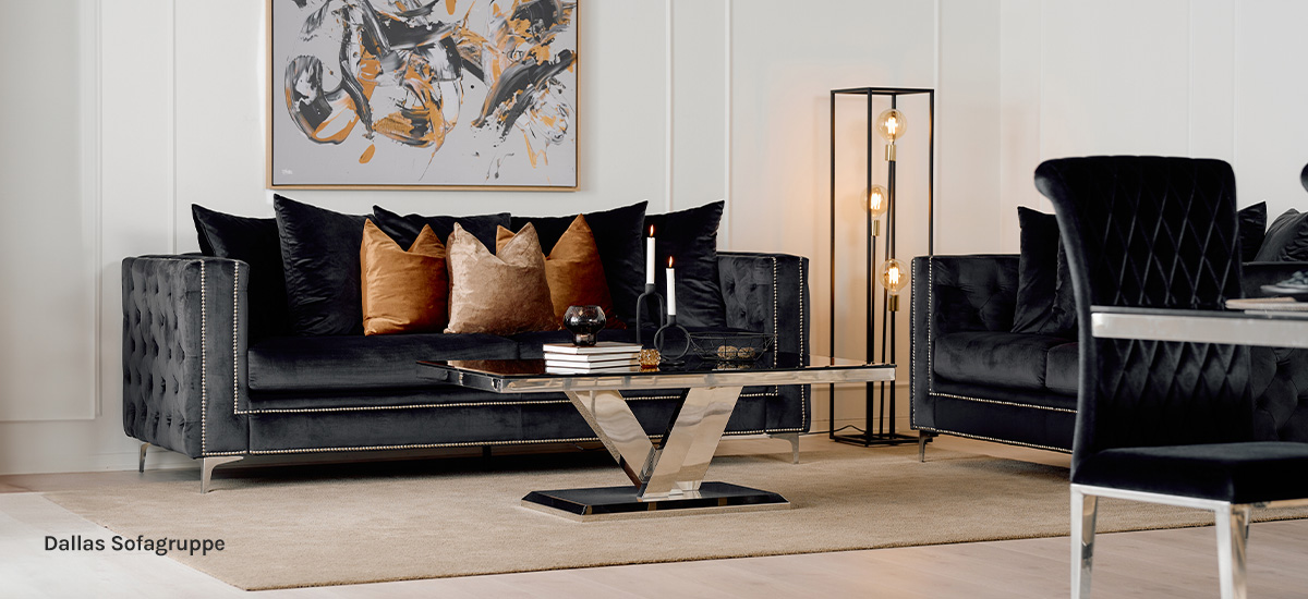 Dallas Sofagruppe fremhever et moderne og smakfullt design, perfekt for å skape et stilfullt fokuspunkt i ethvert rom. Den sorte, myke velouren komplementeres av elegante nagler langs skroget, noe som tilfører et dekorativt og sofistikert uttrykk.