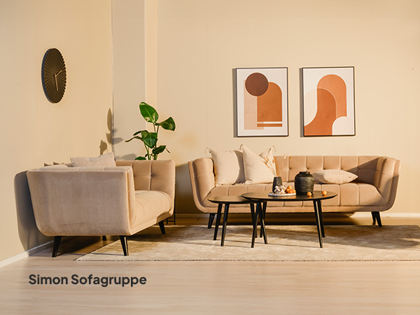 Med Simon Sofagruppe får du en komplett sitteopplevelse som komplementerer ethvert rom. De fastsydde putene og de innebygde pocketfjærene lover en sittekomfort som varer, mens det trendy designet og de høye benene tilfører et snev av luksus til ditt levende rom.