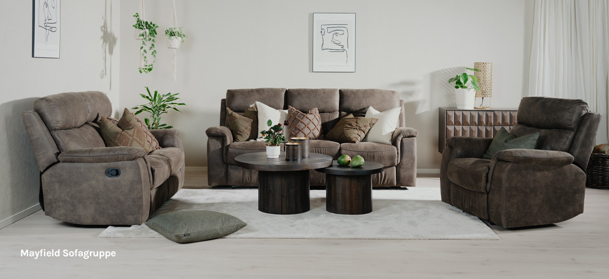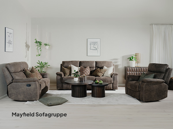Mayfield er en komplett sofagruppe som består av en 3-seter, 2-seter og stol. Denne sofamodellen har praktisk recliner-funksjon, slik at du enkelt kan få opp bena i hvileposisjon. Betjenes ved hjelp av spak på utsiden av armlenet. Dette er et perfekt sted for å slappe av og nyte en god bok, eller se favoritt programmet ditt på TV.
